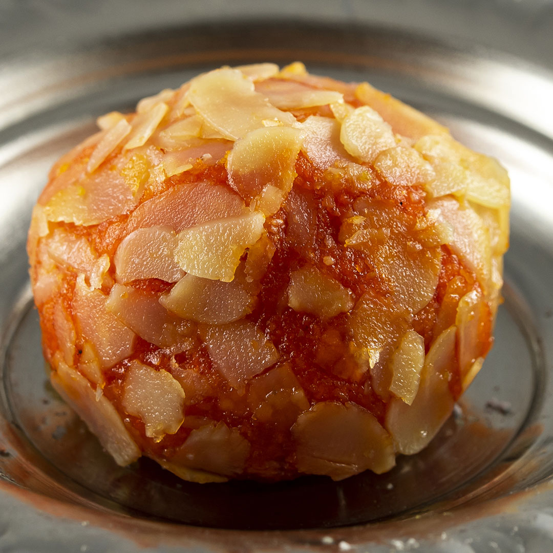 Ingrediënten: amandelpoeder, sinaasappelzest, suiker, eieren, plantaardige boter, water, kleurstof, sinaas concentraat, rijsmiddel en amandelen.